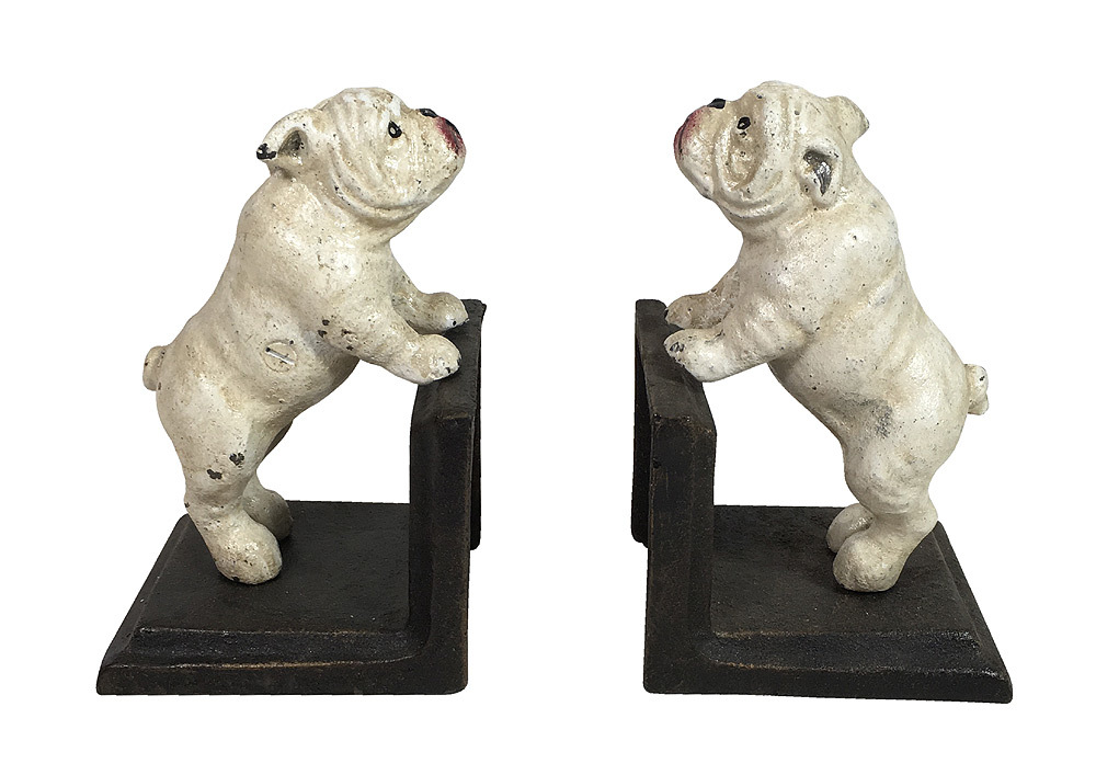 Diese Buchstütze besteht aus 2 seperaten Stützen in origineller Hunde-Optik die in schwerer Qualität aus Gusseisen gefertigt sind. Das niedlich-schräge Design macht diese Buchstütze hierbei so besonders: Mit viel Liebe zum Detail wurde jede Falte, jede Unebenheit und jede Mimik genaustens herausgearbeit. Der typisch brummige Gesichtsausdruck wurde absolut originalgetreu getroffen! Wie ein Fels in der Brandung stehen die kräftigen Doggen stolz auf ihren Sockeln und stützen, ganz nebenbei, Ihre Bücher. Dieses Set ist absolut originell und fällt garantiert auf - Der Hingucker in jedem Bücherregal!