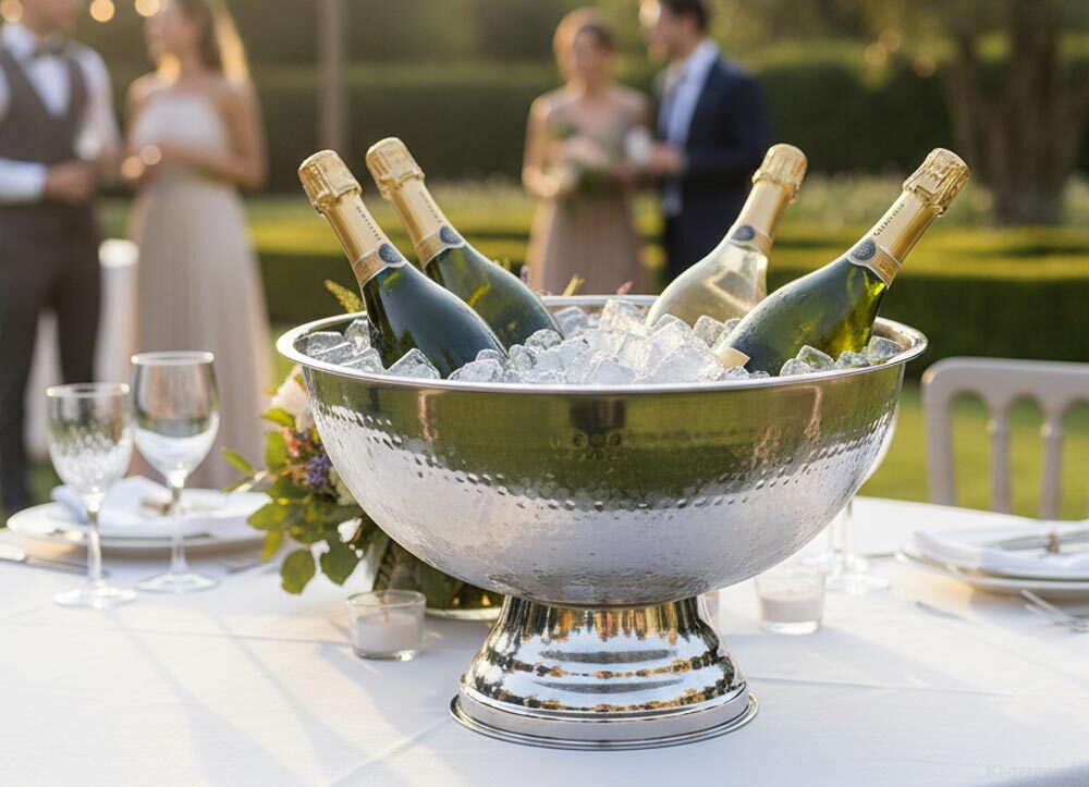 Mit diesem eleganten Sektkühler kannst Du Champagner, Wein oder Sekt stilvoll kühlen. Die edle Champagnerschale aus Edelstahl in Hammereschlagoptik ist der Blickfang der Party, dem Empfang oder der Hochzeitsfeier!