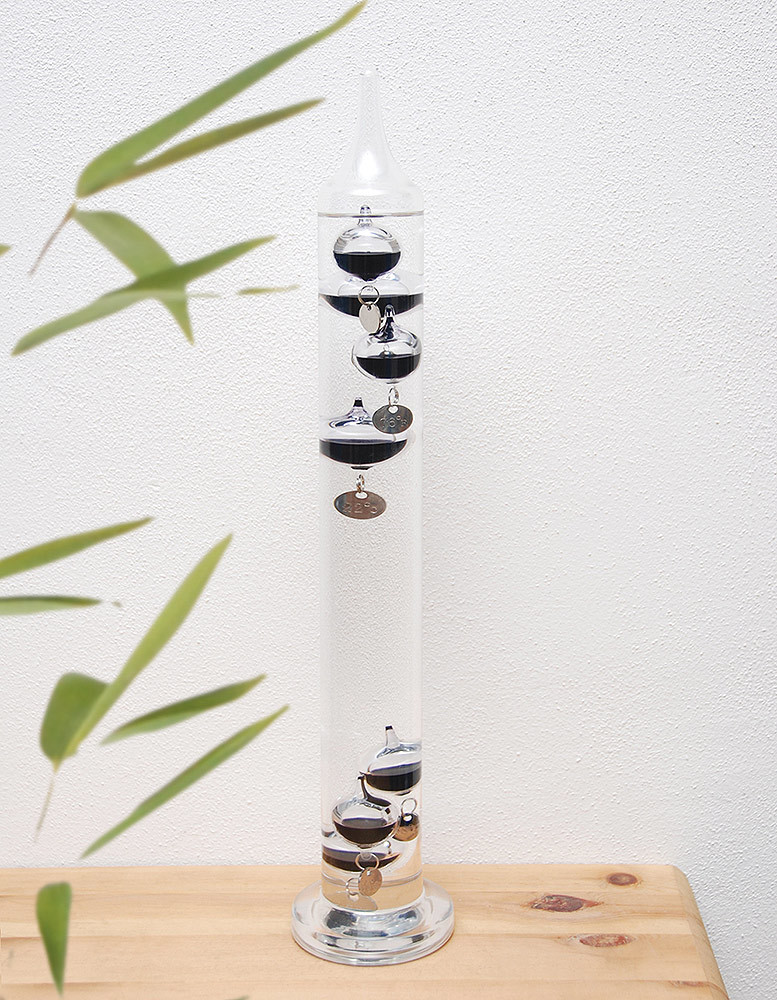 Bei der Suche nach einer Methode die exakte Temperatur zu messen erfand Galileo diese faszinierende Methode. Er legte einige genau abgewogene Kugeln in einen Zylinder mit einer Spezialflüssigkeit. Er stellte fest das die Kugeln sich in der Flüssigkeit je nach der Außentemperatur hoben oder senkten.