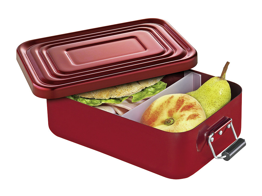 Küchenprofi Lunch Box - Leichter Couscous-Salat oder Vollkornbrot mit Hähnchenbrust und Salat, dazu ein paar Nasch-Tomaten. Das könnte auch in Ihrer Lunchbox von KÜCHENPROFI liegen. Und wenn die Kollegen nach dem Kantinen-Essen ins Suppenkoma fallen, starten Sie voller Energie in die zweite Tageshälfte. Oder nehmen Ihren Snack gleich im Park ein. Auch in der Schule oder beim Sport sind die Lunchboxen eine gute Alternative zum Angebot vom Kiosk. In dem Aluminium bleibt der Inhalt lange kühlschrankfrisch, Sie können die Box schon am Vorabend befüllen. Die Verschlüsse halten dicht, da kullert nichts durch die Tasche. Der Trennsteg hält von innen Ordnung. Offen für Neues? Dann lassen Sie sich doch mal von Ihrem Liebsten oder dem Nachwuchs eine Überraschungs-Box packen.