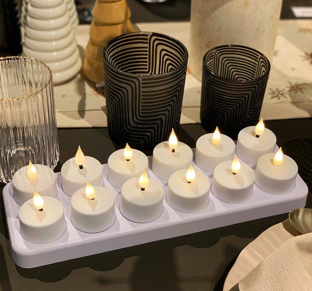 - Das Set beinhaltet 12 Teelichter mit warmweißem LED-Licht & 1 Ladestation mit USB-Kabel.