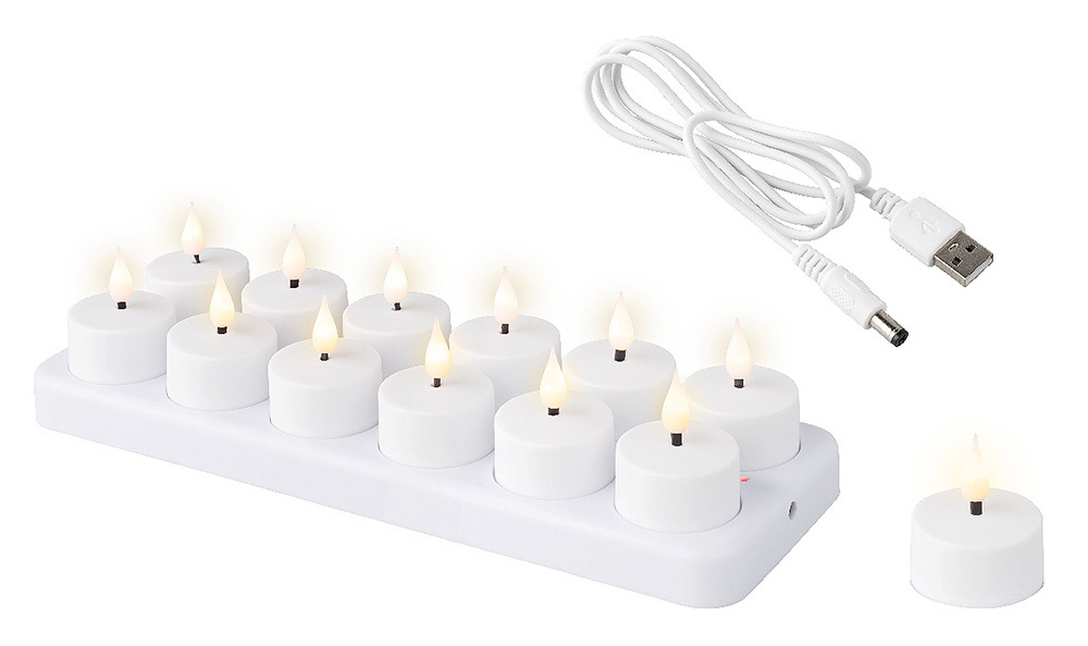 - Lieferumfang: 1 Ladestation mit Kabel und USB-Stecker; 12 LED Teelichte.