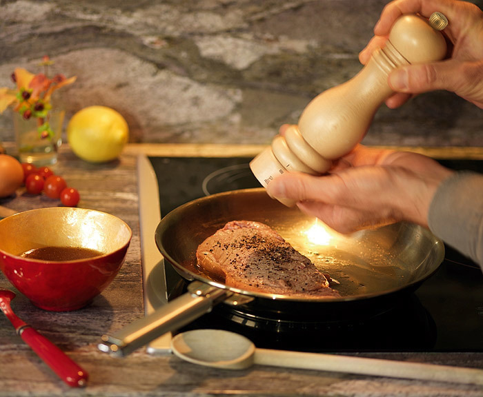- Das Pfeffermahlwerk, bestehend aus einer zweireihigen Spiralverzahnung, führt und hält die Pfefferkörner für ein perfektes Mahlen. Der Stahl des Mahlwerks der Pfeffermühle ist gegen Korrosion behandelt. Dies erhält seine Schneidfähigkeit und garantiert lange Haltbarkeit. In einem Rollwerk: weltweit einzigartig im Nahrungsmittel-Bereich.