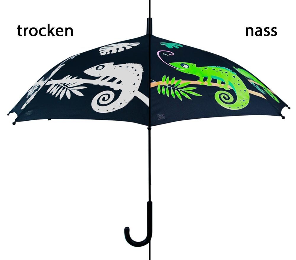 - Die Chamäleon-Motive verleihen dem Schirm eine besonders originelle Note.
