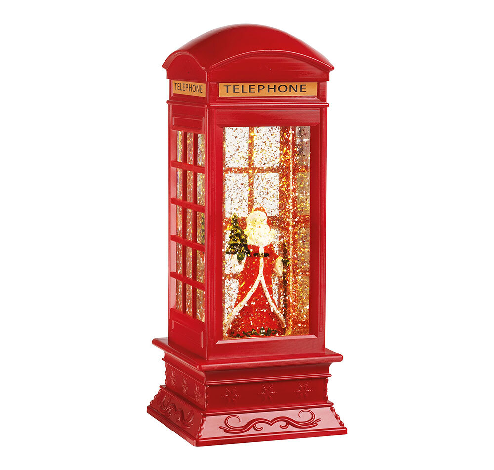 Diese wunderschöne Schneelaterne in origineller Telefonzellen-Optik verbreitet eine romantische Schneekugel-Atmosphäre und lässt Herzen höher schlagen! Im Inneren der Laterne verbirgt sich eine kleine Weihnachtsmann-Figur mit Tannenbaum. Gefüllt mit Wasser, steigt auf Knopfdruck feiner Glitzer auf, der langsam wieder herab sinkt. Untermalt wird diese traumhafte Szene mit seichter, warmweißer LED-Beleuchtung.