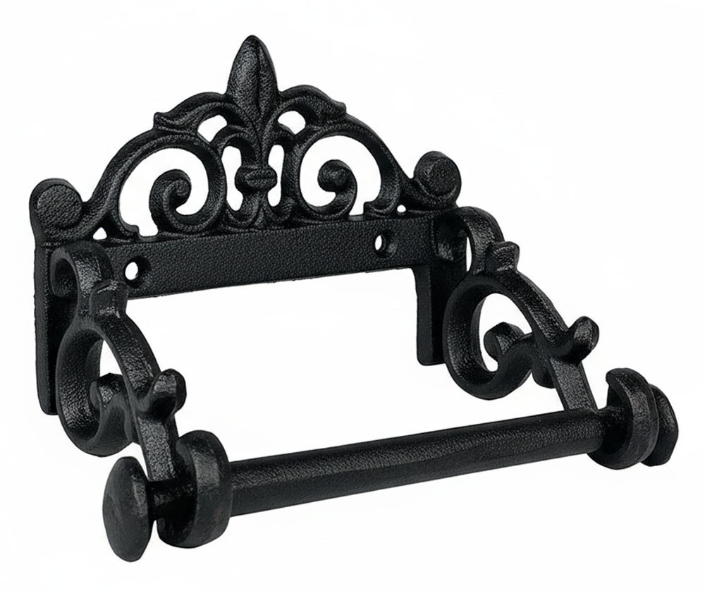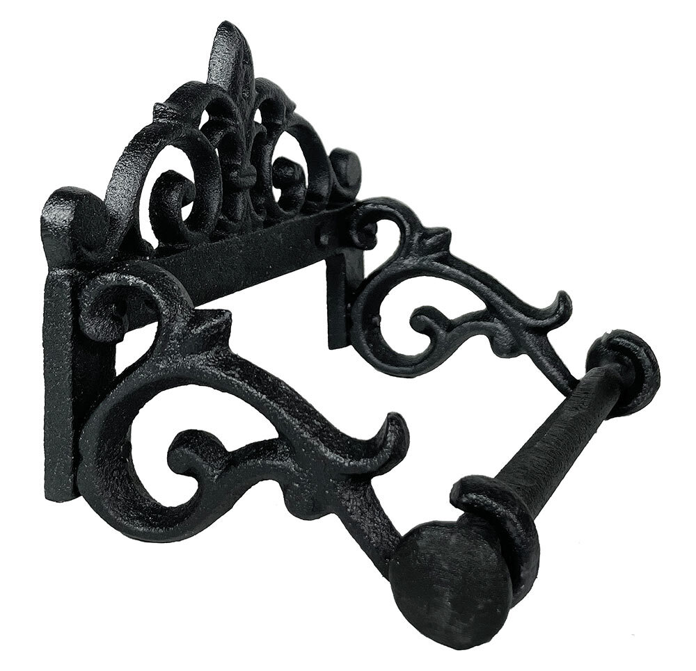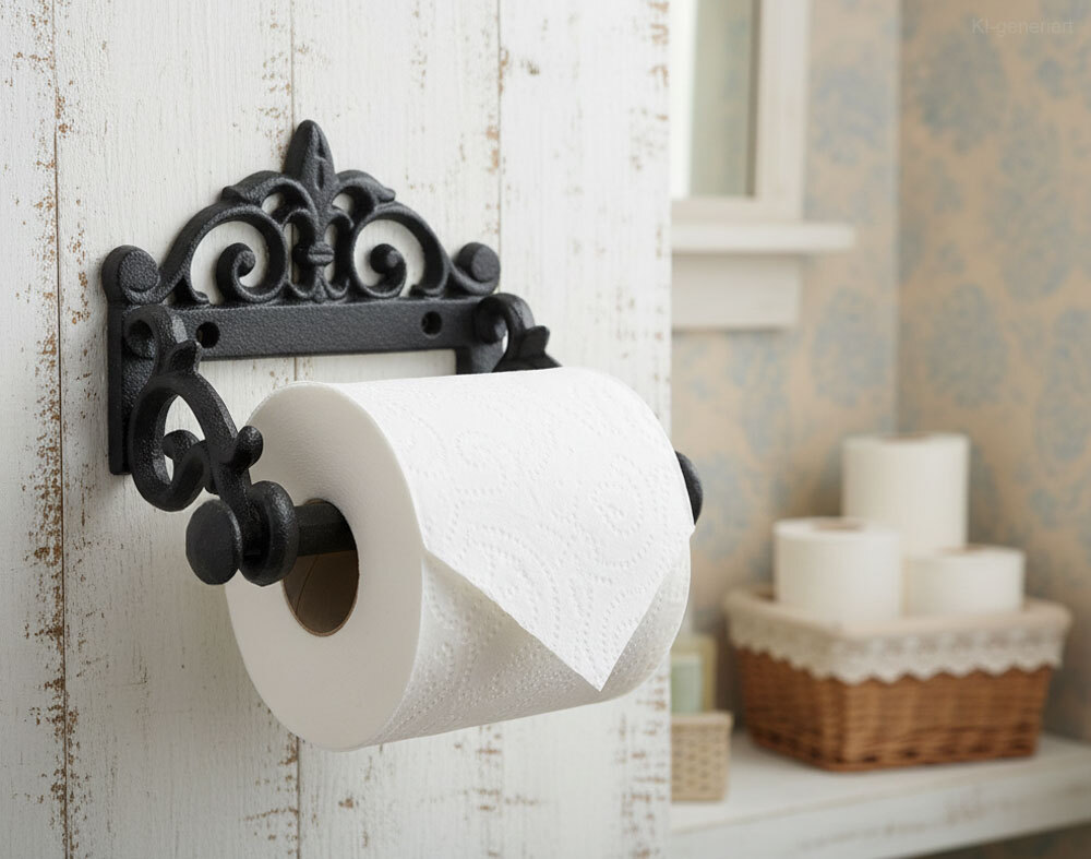 Dieser aussergewöhnliche Toilettenpapierhalter ist im Jugend-Stil in rustikaler Handarbeit aus Gusseisen gefertigt und schwarz lackiert.