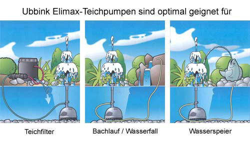 Die bewährten Ubbink Elimax Pumen stehen für hohe Förderleistung, Zuverlässigkeit und lange Lebensdauer. Geeignet als Springbrunnenpumpe, Filterpumpe, Bachlaufpumpe.