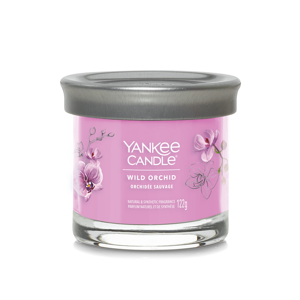Yankee Candle Duftkerze im formschönen Signature Style mit Duftnote Wild Orchid - Reisen sie mit Yankee Candle Wild Orchid an einen paradiesischen Ort der voller süßen Düften, Blütennoten und reifen Früchten nur so sprießt.