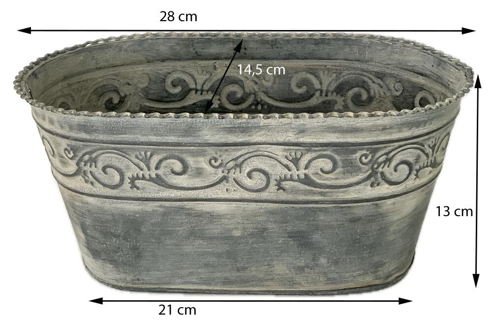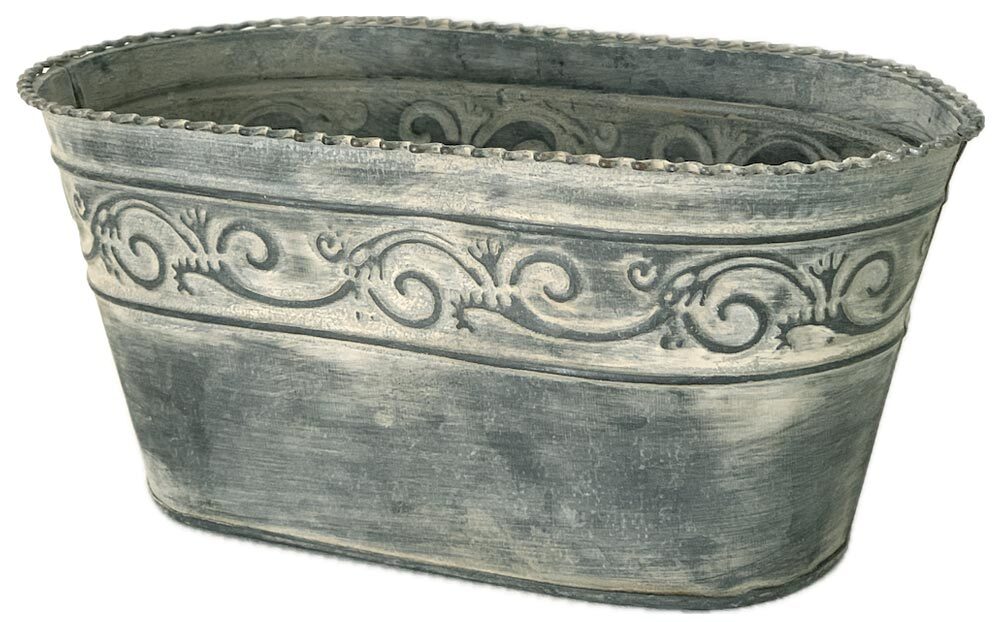 - Der Pflanzeimer ist aus Altzink gefertigt und kunstvoll verziert. Der formschöne Zierrand ist ein besonderer Blickfang.